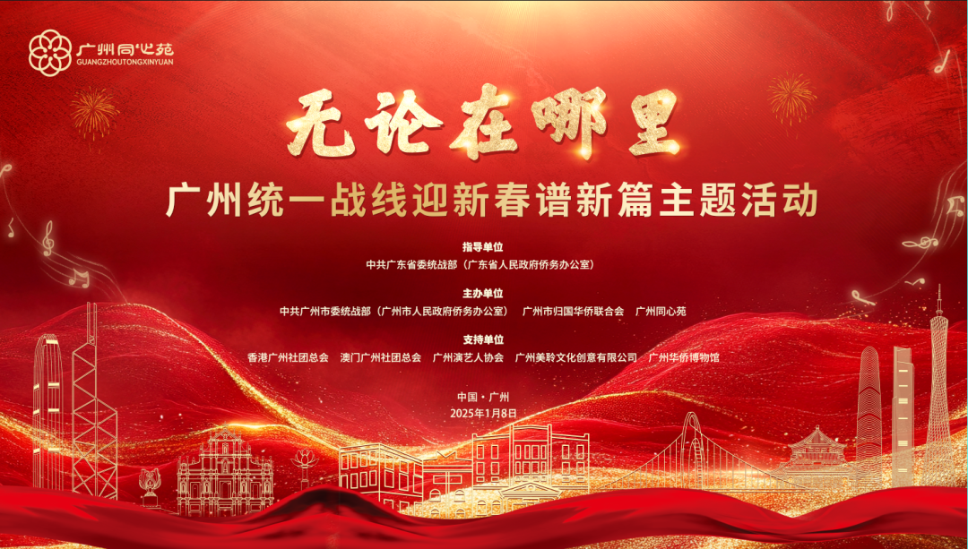 1月8日,由广东省委统战部(省侨办)指导,广州市委统战部(市侨办)、市侨联、“广州同心苑”主办,香港广州社团总会、澳门广州社团总会、广州演艺人协会、广州美聆文化创意有限公司、广州华侨博物馆支持的“‘无论在哪里’——广州统一战线迎新春谱新篇主题活动”在广州华侨博物馆举行。省、市统一战线有关单位负责同志,市各民主党派、各统战团体负责人,港澳台侨代表人士,以及统一战线相关人员共250余人参加。