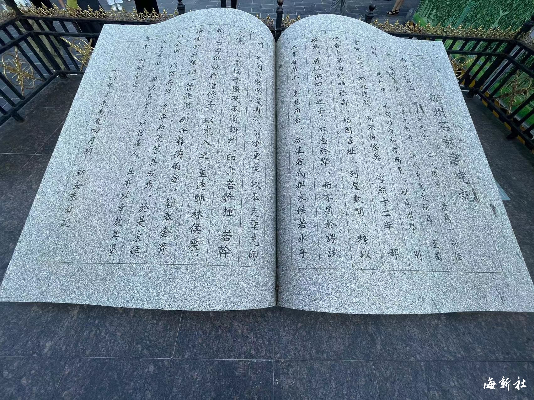 石鼓书院广场是去石鼓书院的必经之路。在石鼓广场,最引人注目的是一块长2.4米,宽1.8米的巨型石书。这本石头书的内容是南宋理学家朱熹在这里讲学时写的一篇文章,名为《衡州石鼓书院记》。他形容石鼓书院是“聚蒸湘之会,江流环带,最为一郡佳处。被称为石鼓书院第一绝,叫做“有书翻不动”。它的翻不动不仅意味着它是一本石头做的书而没办法去翻阅。其实更多的是寓意石鼓书院一千多年的深厚历史,非常的沉重,使世人不能轻易的将它翻动。在巨石左侧不远处,有一棵大银杏树。据说石鼓七贤曾经在这树下乘凉,喝茶,聊天。
